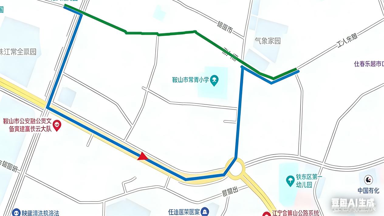 工人街與園林大道交通崗轉,直行至園林大道與解放東路交通崗左轉,直行新營廣場,沿常青街直行至工人街與常青街交通崗右轉,恢復原線。