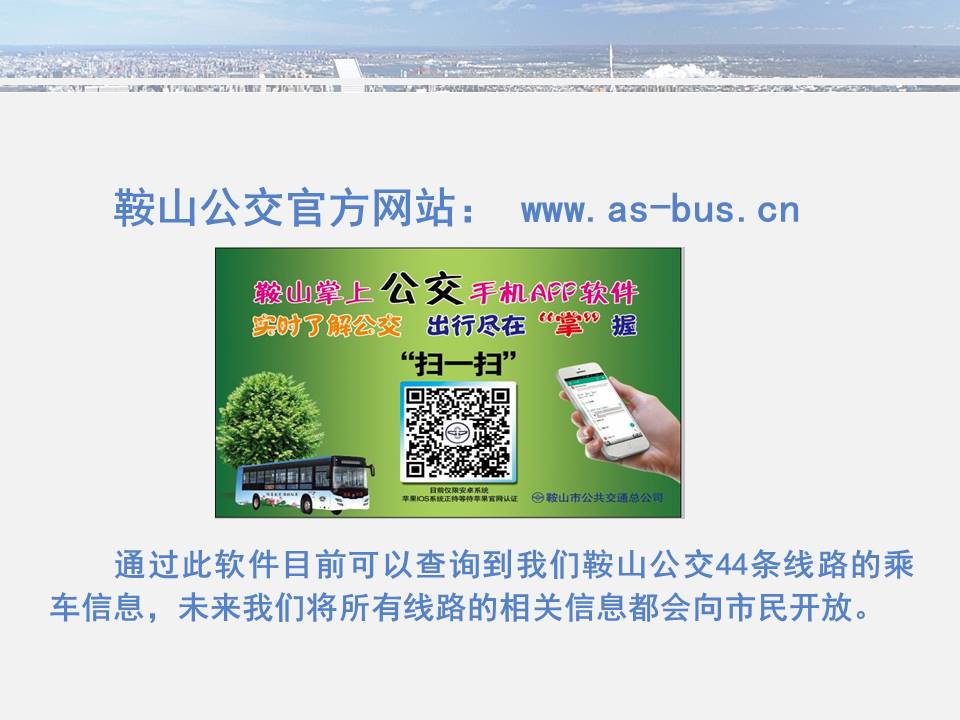 點點手機就可以看到公交車目前所在的位置,精準(zhǔn)地掐好出門時間,從而避免在惡劣天氣或高峰期苦苦候車,工作人員坐在調(diào)度室內(nèi)就能掌握車輛在路上的運行情況……為方便廣大市民出行,基于安卓平臺開發(fā)的“鞍山掌上公交”官方APP將于11月15日正式上線試運行,適用于蘋果IOS系統(tǒng)的APP將于明年初上線,市民可在公共交通總公司官網(wǎng)下載該軟件,并實現(xiàn)37條公交線路車輛實時查詢的便利服務(wù)。 近年來,市公交總公司借助“互聯(lián)網(wǎng)+公交”發(fā)展理念,以創(chuàng)建國家低碳環(huán)保示范城市為契機,大力推進智能公交建設(shè),目前已在56條公交線路實現(xiàn)了GPS調(diào)度指揮,可實現(xiàn)車輛實時監(jiān)控,運營趟次查詢、行車計劃查詢、超速查詢等29項報表查詢分析功能,極大地提高了車輛利用率及企業(yè)管理科學(xué)化水平。智能公交的廣泛應(yīng)用不但讓市民出行更加便捷,也讓公交從業(yè)人員的工作更輕松。