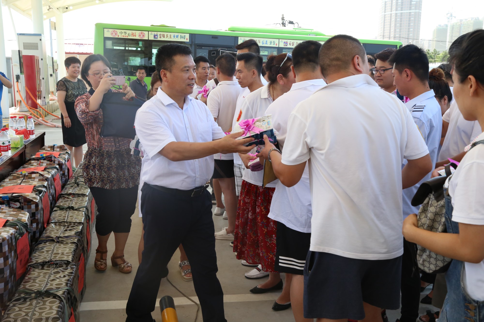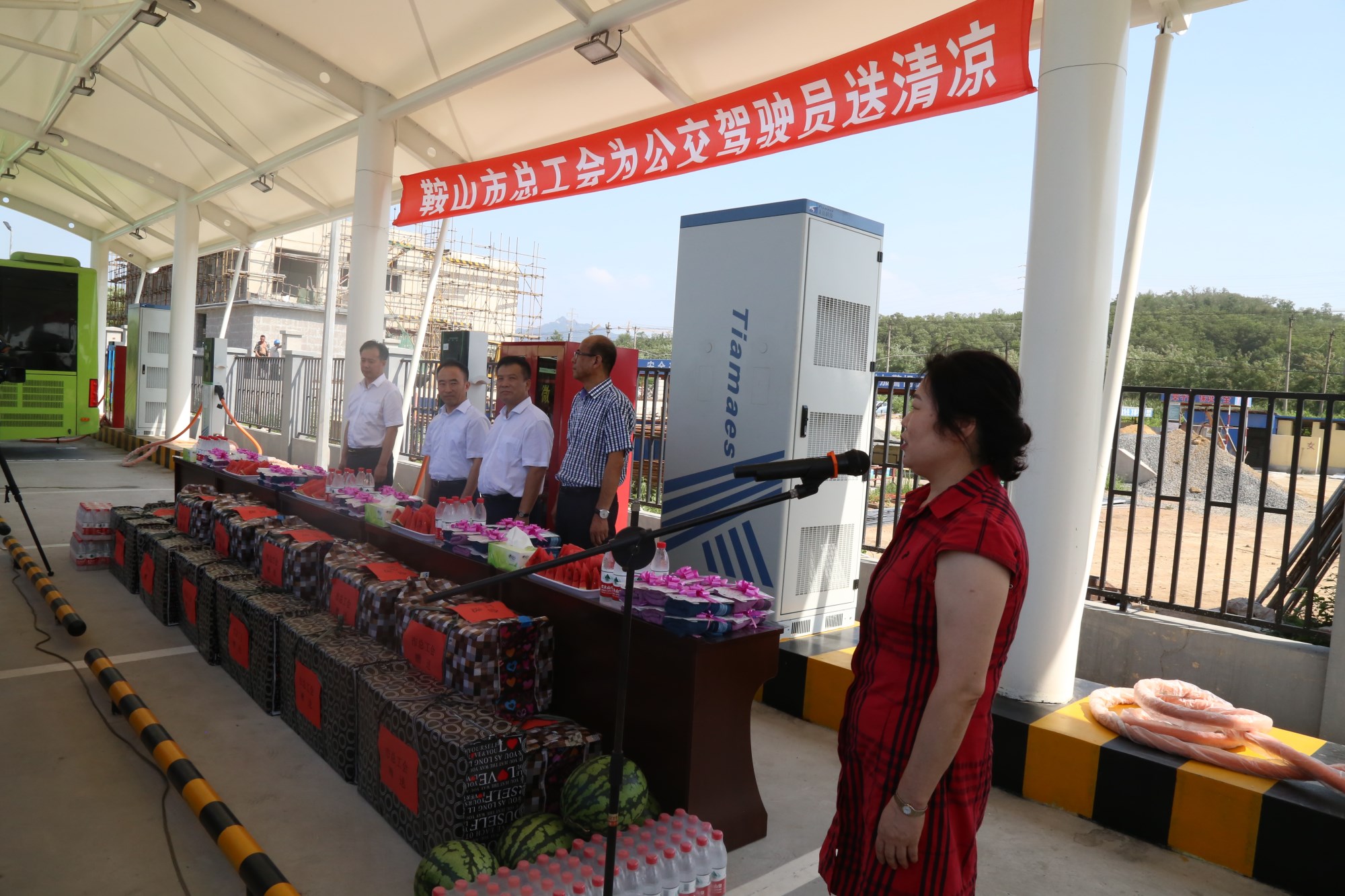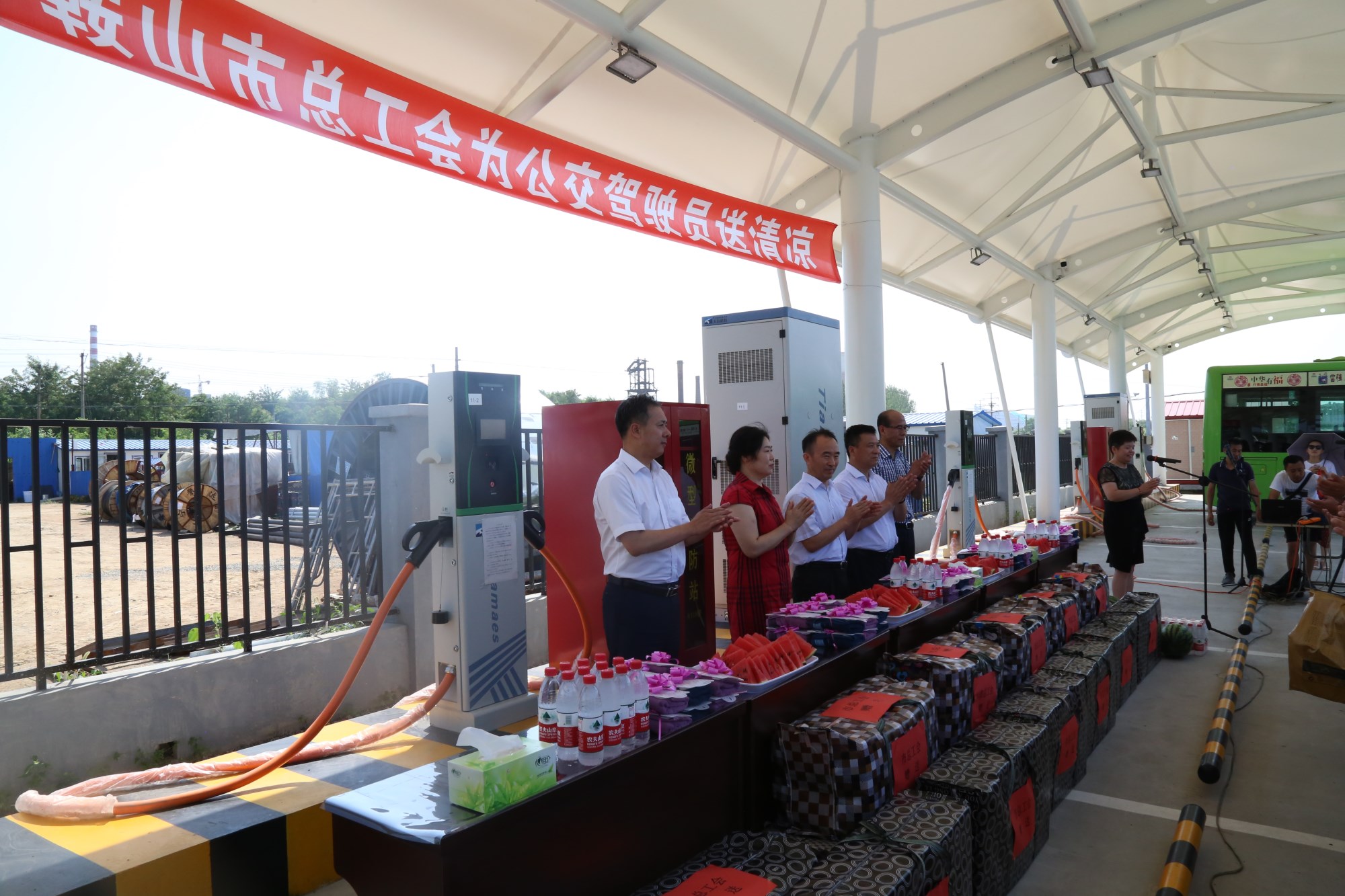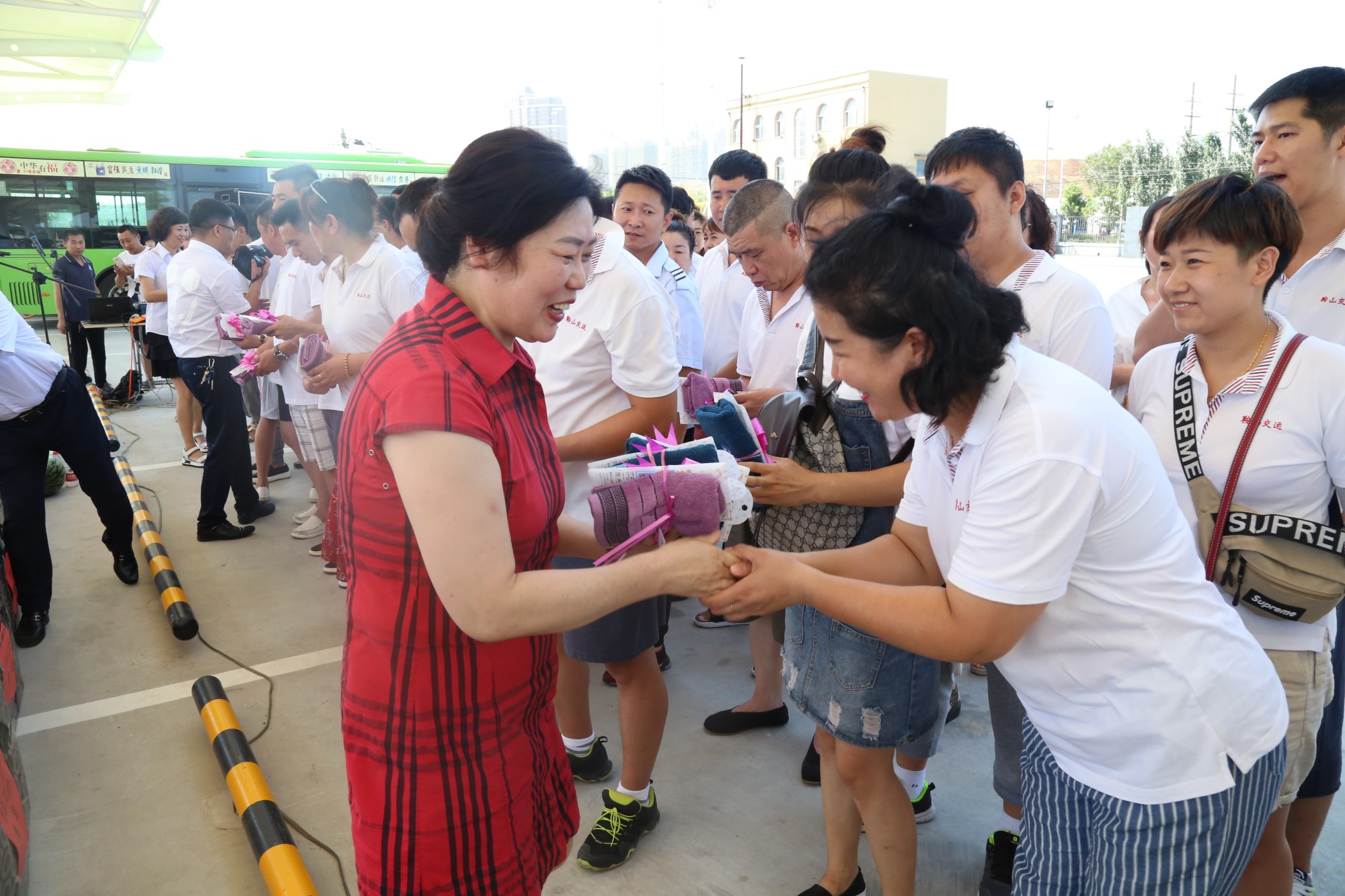 201881日下午,鞍山市總工會(huì)在交運(yùn)集團(tuán)第二汽車(chē)分公司216路終點(diǎn)站舉行了為公交一線駕駛員送清涼活動(dòng)。鞍山市人大常委會(huì)副主任、市總工會(huì)主席解永孚;市總工會(huì)副主席李展程;市國(guó)資委黨委書(shū)記、主任顧洪新等領(lǐng)導(dǎo)來(lái)到216路調(diào)度室看望了交運(yùn)集團(tuán)一線駕駛員,為他們送去夏日里的清涼與工會(huì)組織的慰問(wèn)。交運(yùn)集團(tuán)黨委書(shū)記、董事長(zhǎng)羅玉艷;總經(jīng)理王春江;黨委副書(shū)記、紀(jì)委書(shū)記、工會(huì)主席金秀石出席了活動(dòng);顒(dòng)中,交運(yùn)集團(tuán)黨委書(shū)記、董事長(zhǎng)羅玉艷向市總工會(huì)領(lǐng)導(dǎo)介紹了企業(yè)生產(chǎn)運(yùn)營(yíng)情況,并代表集團(tuán)職工向市總工會(huì)表示感謝。隨后,市總工會(huì)主席解永孚代表市總工會(huì)對(duì)高溫酷暑中仍堅(jiān)守崗位、辛勤工作的交運(yùn)一線職工致以親切的問(wèn)候,希望交運(yùn)集團(tuán)廣大職工繼續(xù)發(fā)揚(yáng)艱苦奮斗、愛(ài)崗敬業(yè)精神,注意防暑和行車(chē)安全,以更好的狀態(tài)投入到工作中服務(wù)好市民乘客,并將市總工會(huì)撥付的2萬(wàn)元慰問(wèn)金交到交運(yùn)集團(tuán)董事長(zhǎng)手中。第二汽車(chē)分公司2路線駕駛員謝金紅在活動(dòng)中代表一線駕駛員作了表態(tài)發(fā)言。最后,各級(jí)領(lǐng)導(dǎo)在現(xiàn)場(chǎng)親手將交運(yùn)集團(tuán)工會(huì)為一線職工準(zhǔn)備了冰袖、毛巾、西瓜、冰鎮(zhèn)礦泉水等慰問(wèn)物資發(fā)到職工手中。