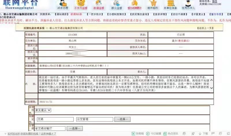 劉女士在反饋件上寫到:各位相關(guān)領(lǐng)導(dǎo),你們好!事情的經(jīng)過是這樣:我母親早晨在鐵西八家子等車,由于不知道八家子這個站點已經(jīng)不停站,等了30多分鐘,經(jīng)過好心人的提醒就往前一站行走,由于早晨天氣特別冷,老人在行走的途中就看見一輛410公交車,一路小跑,其實這時車已經(jīng)到達站點,本可以開走,但是看到我母親一路小跑還帶那么多東西,在車站等待我母親上車才開走,如果司機師傅不停車等待,在寒風瑟瑟的早晨,我母親不知道又要等待多久!我母親在車上多次感謝司機,并要詢問姓名表示一定要寫感想信,但司機師傅卻做好事不留名,這是一種什么精神!我覺得新時代鞍山應(yīng)該需要這樣為老百姓著想還不留名的好司機!我為他點贊!也懇請公交公司的領(lǐng)導(dǎo)多宣揚這個人的事跡,為寒風瑟瑟的秋季增加一絲溫暖!車牌號碼是遼CD1503,早晨7點28分到的二十六中學車站(八家子方向開來)。